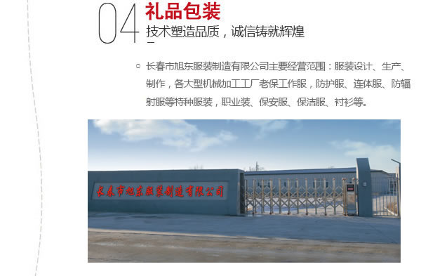 吉林省長(zhǎng)春市旭東服裝廠,電話:13578777918,提供工作服,工裝定制,勞保服,保安服,職業(yè)裝定制,本公司是一家集生產(chǎn),設(shè)計(jì),制作,銷(xiāo)售為一體的多元化公司。長(zhǎng)春市旭東服裝制造有限公司成立于2003...[查看更多]